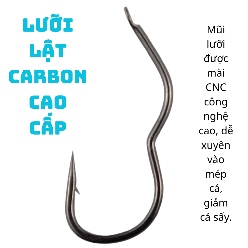 • 🔹 Tự động lật móc cá: Thiết kế thân cong và ngả về sau giúp lưỡi tự động lật vào miệng cá khi đớp mồi – tăng tỉ lệ dính cá, giảm cá sẩy.